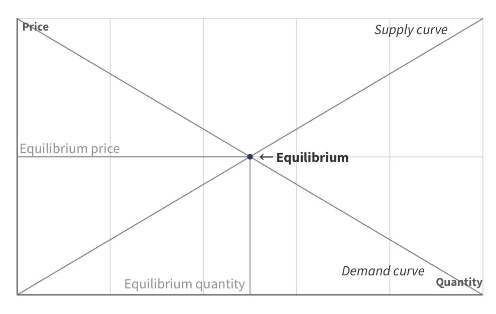 With an upward-sloping supply curve and a downward-sloping demand curve, it is easy to visualize that the two will intersect at some point. At this point, the market price is sufficient to induce suppliers to bring to market the same quantity of goods that consumers will be willing to pay for at that price. Supply and demand are balanced or in equilibrium. The exact price and amount where this occurs depend on the shape and position of the respective supply and demand curves, each of which can be influenced by several factors.