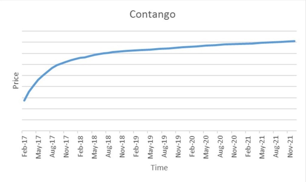 When a market is in contango, the forward price of a futures contract is higher than the spot price. In the chart below, the spot price is lower than the futures price which has generated an upward sloping forward curve. This market is in contango – the futures contracts are trading at a premium to the spot price. Physically delivered futures contracts may be in a contango because of fundamental factors like storage, financing (cost to carry) and insurance costs. The futures prices can change over time as market participants change their views of the future expected spot price; so the forward curve changes and may move from contango to backwardation.
